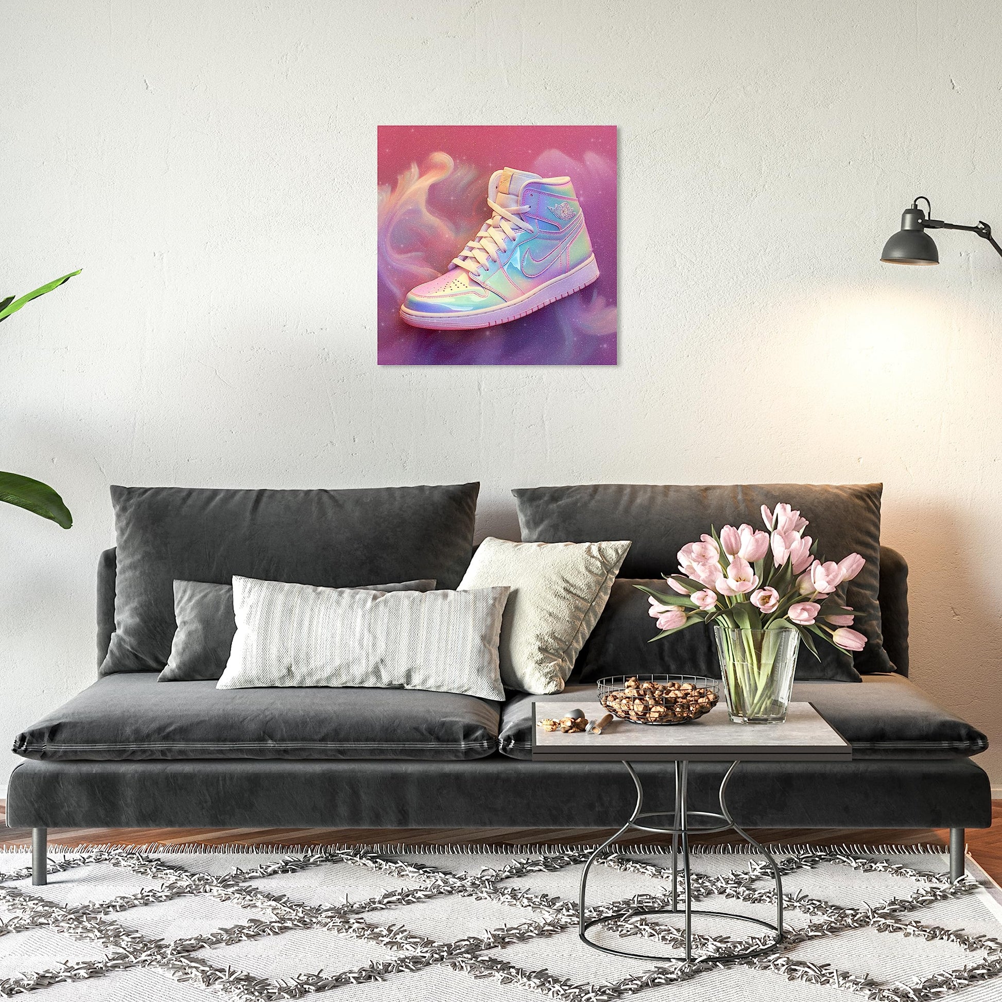 Wynwood Studio Fashion and Glam Contemporary Canvas Art - Holo Dreams Sneaker, Wall Art for Living Room, Bedroom, and Bathroom, 20 in x 20, Pink and Purple Home Decor