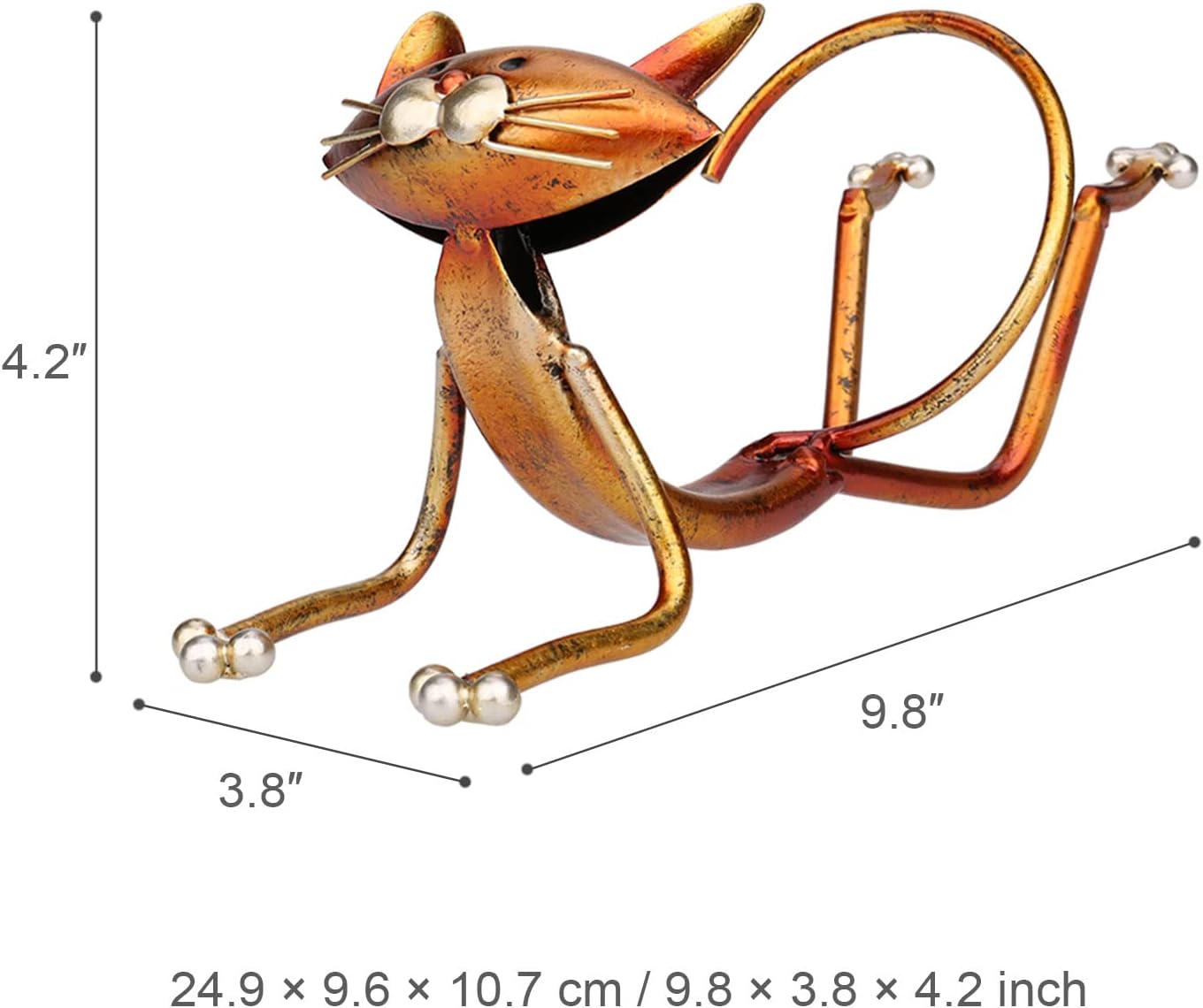 It is not only an animal sculpture, but also a practical wine bottle holder. The design is creatively beautiful: the kitten is doing yoga, and its curved tail and ears are designed to hold your wine bottle just right. It is made of refined iron and advanced welding technology, the product is of high quality and able to take weight. With the painting technology, the sculpture is stainless, and the paint won’t peel off.
