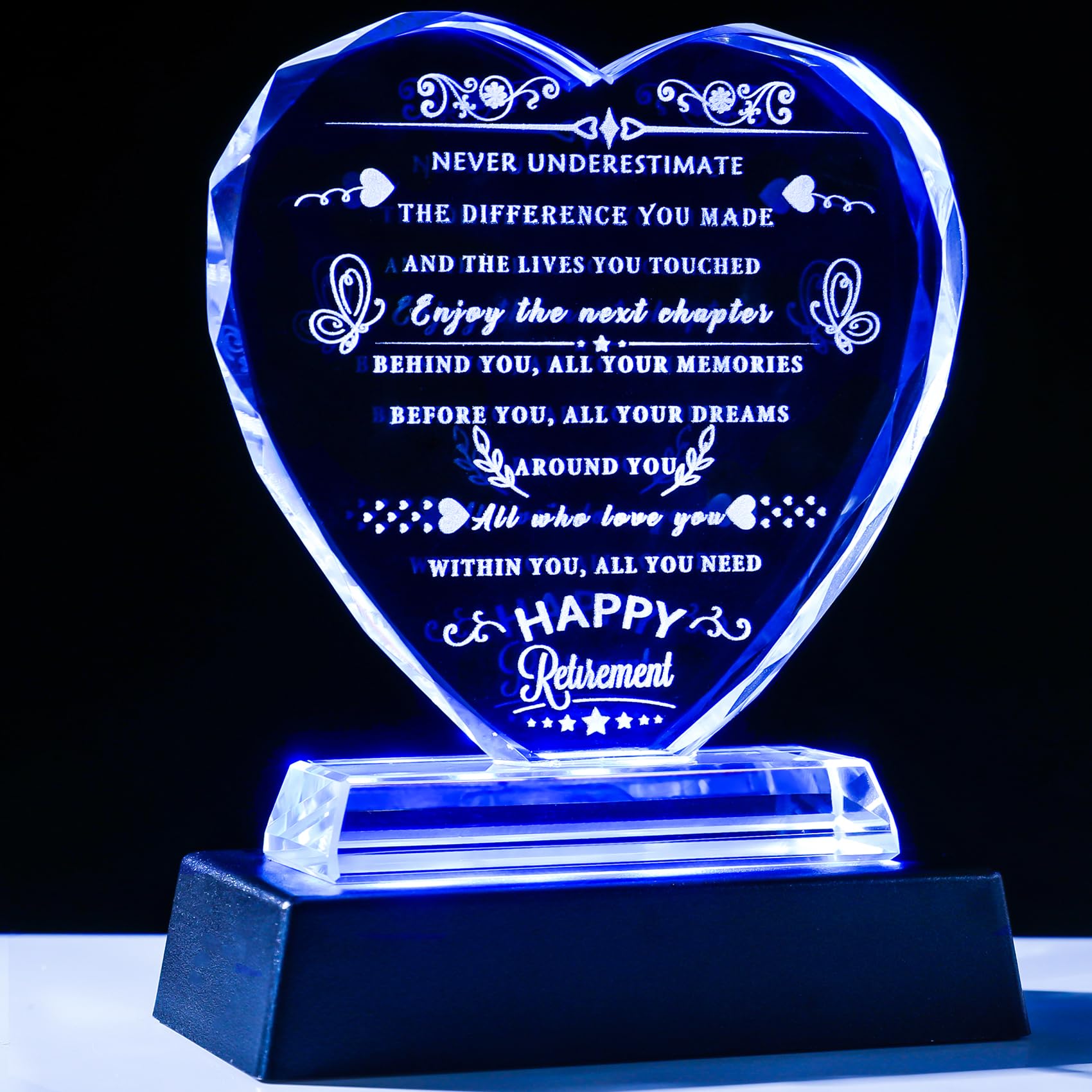YWHL Retirement Gift for Woman 2024 with LED Base Best Retirement Gifts Ideas for Men Happy Retirement Appreciation Gift for Coworkers Crystal Heart Plaque Going Away Farewell Goodbye Gift for Retired