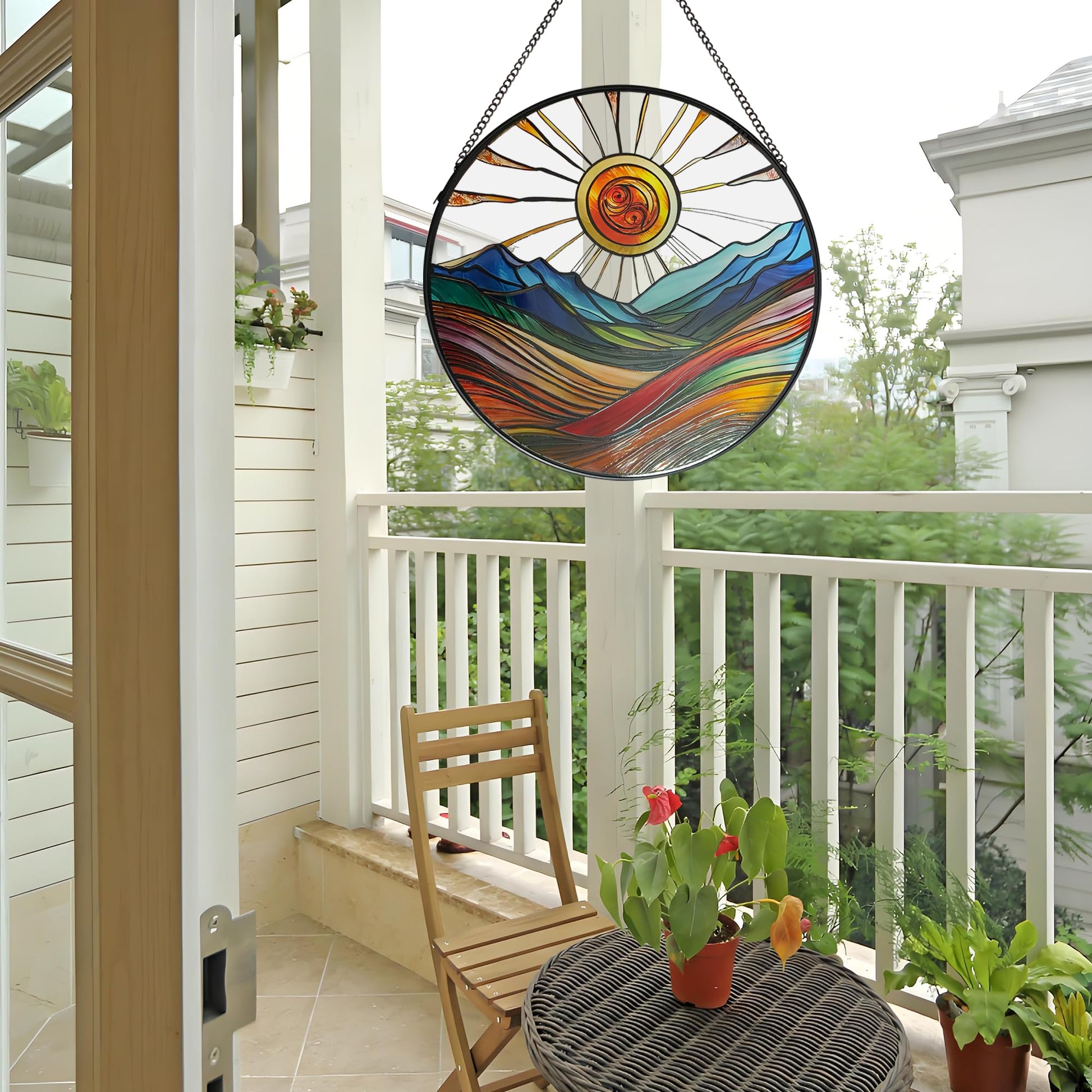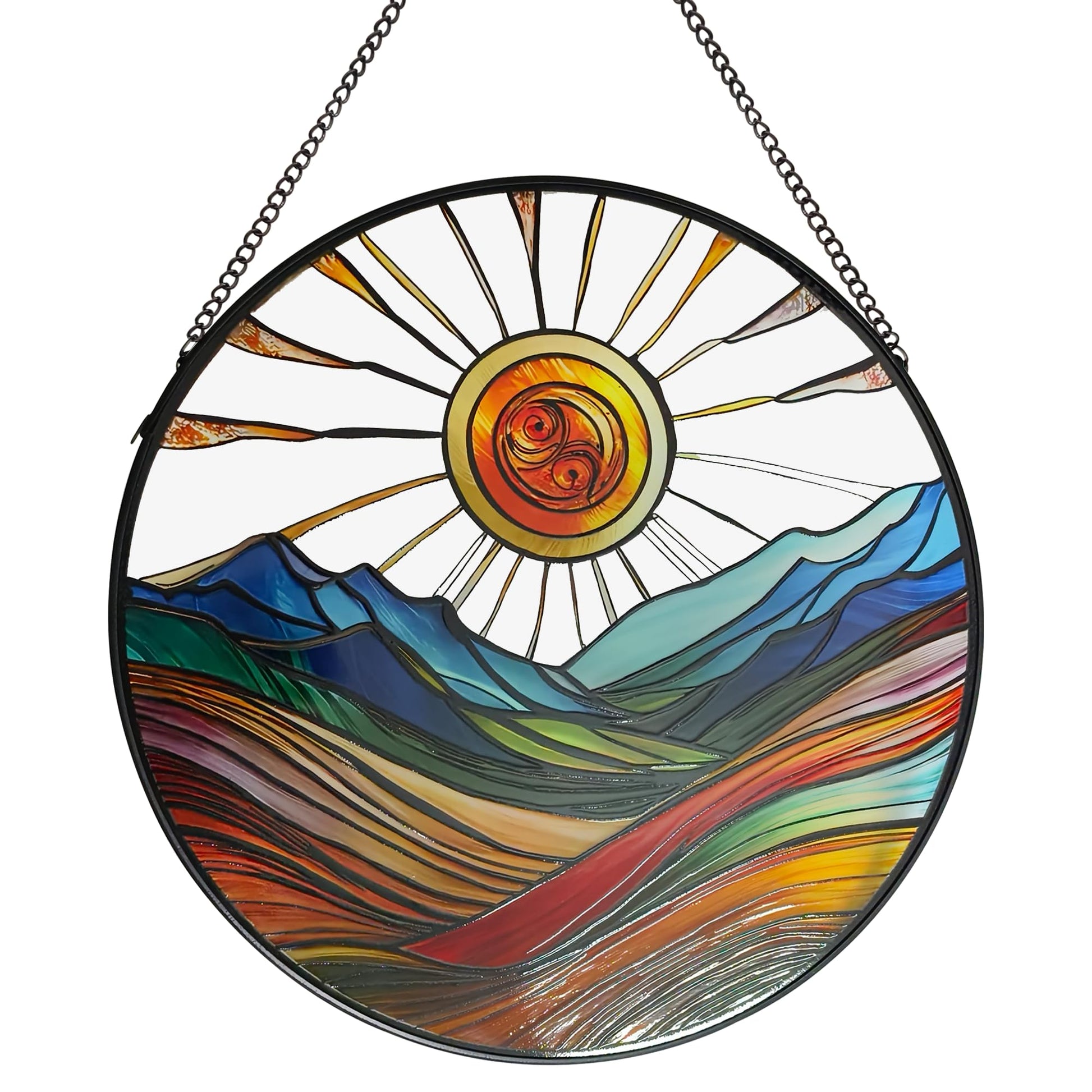 ZUSANG Sun Mountains Stained Glass Window Hanging, 9.8’’Sun Catcher Glass Panel Boho Wall Art Decor with Chain, Hand Painted Round Glass Gifts for Couples, Housewarming Gift